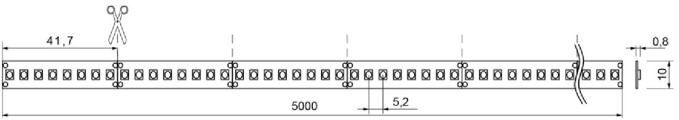 * Aufgrund des Spannungsfalls über die Länge der Leiterplatte, nimmt die Gesamtleistung der Leiterplatte mit zunehmender Länge ab und differiert von der theoretischen Leistungsangabe (5m = 150W).