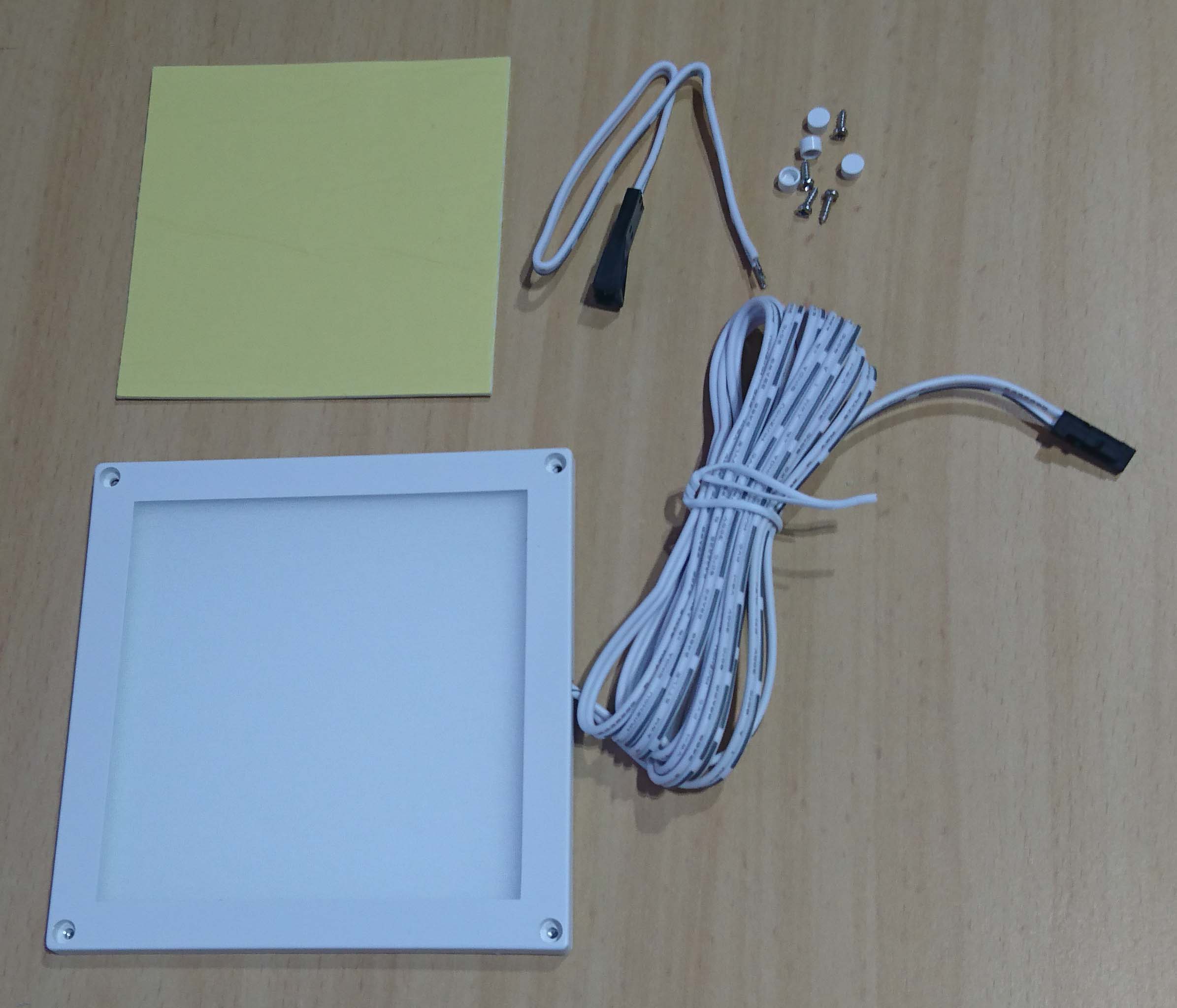 Lieferung inkl. Klebepad, 4 kleinen Gummistopfen zur Abdeckung der Schraublöcher, inkl. konfektioniertem, 2m langen Anschlusskabel, inkl. eines kurzen Kabels mit Buchse, ggf. zur Erstellung einer steckbaren Verbindung zum Netzgerät nutzbar.