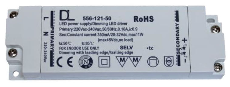 Dimmbar 20-100%, Konstantstrom 350mA, 20-32V dc, L x B x H = 122 x 39 x 18mm. ACHTUNG: Daten des Dimmers beachten (z. B. Mindestleistung)