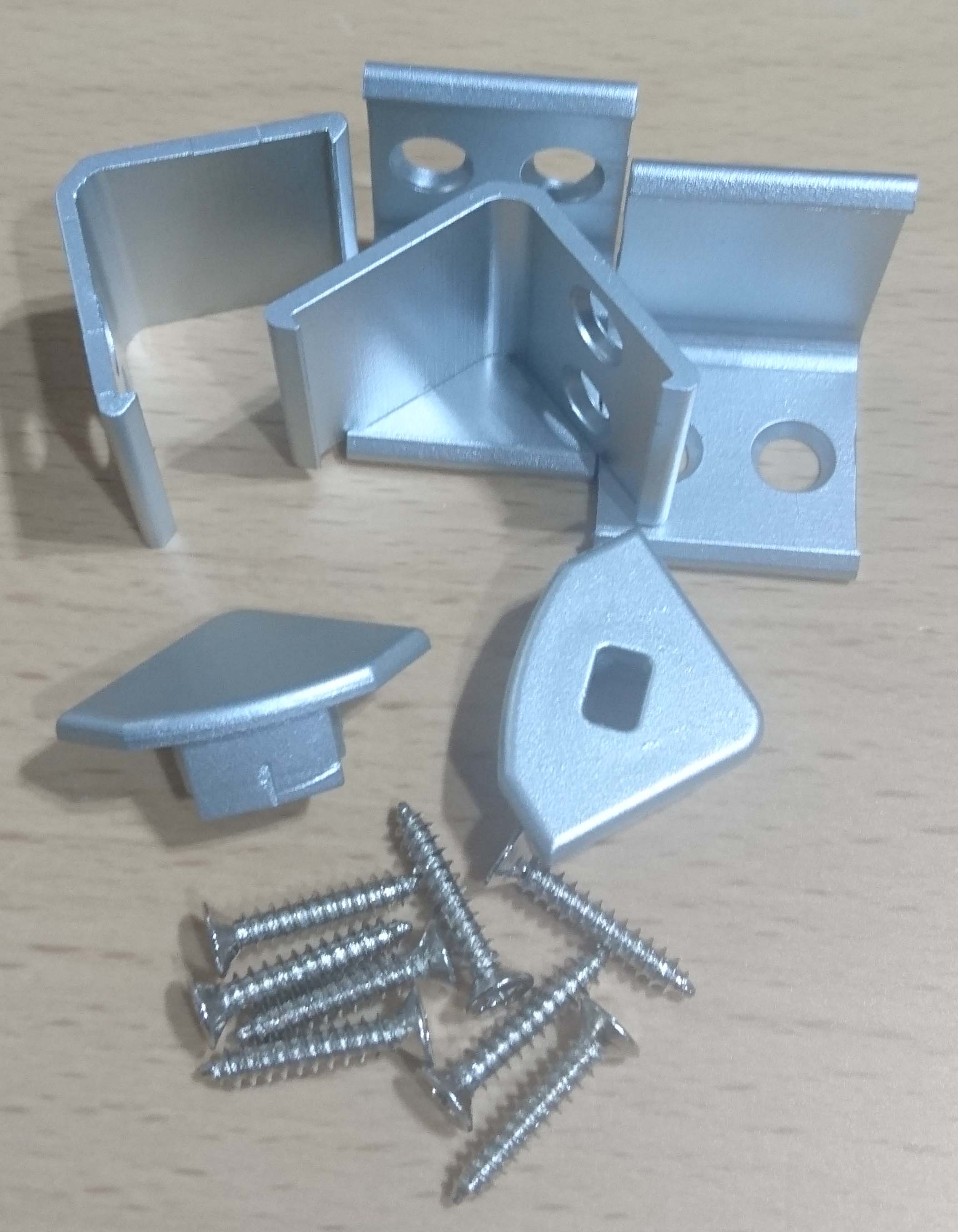 1 Endstück mit Kabelloch, 1 Endstück ohne Kabelloch, 4 Klammern, 8 Schrauben